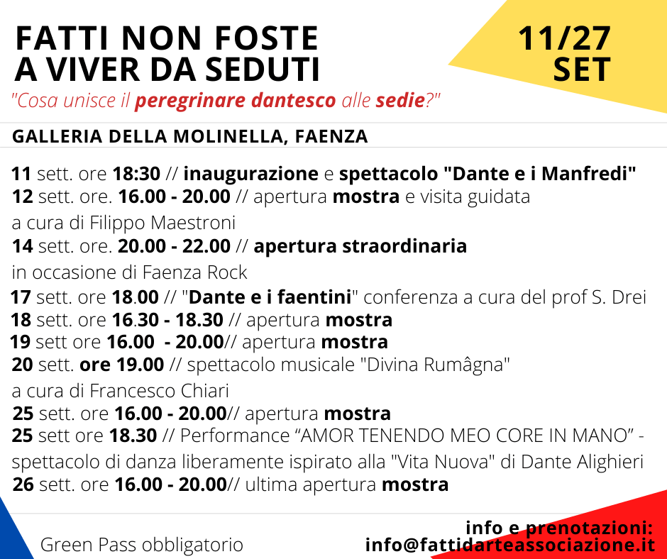 – il 25 settembre apertura mostra dalle 16 alle 20 ore 18.30 performance di danza ispirato alla vita nuova “Amor tenendo meo core in mano” – a cura di Agorá Danzaa asd