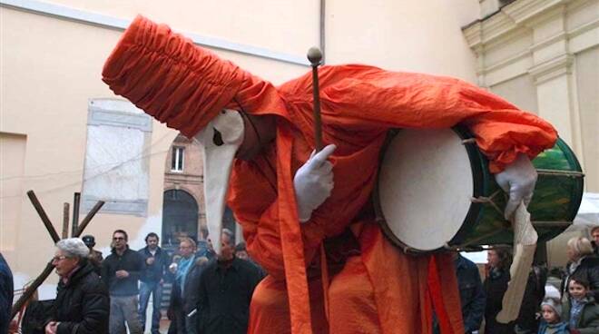 Esendofio, personaggio immaginario simbolo della Fiera aspetta i visitatori sui trampoli per stupire grandi e piccini.
